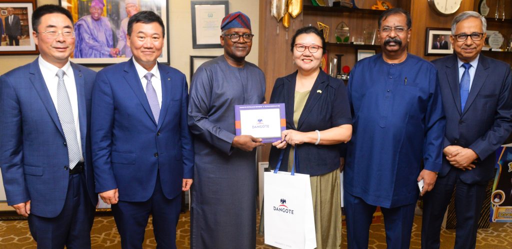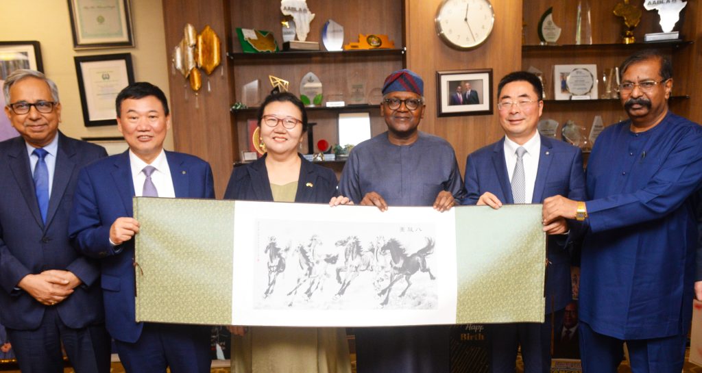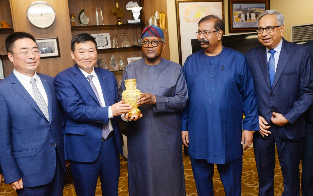 L-R: Chairman of the Board, Sinoma International Engineering Co. Ltd., Lin Zhisong; Chairman, Sinoma International Engineering Co. Ltd., Yin Zhisong; President/CE, Dangote Industries Limited, Aliko Dangote; Consulate General of the People’s Republica of China, Yan Yaqing; Vice President Oil & Gas, Dangote Industries Limited, Devakumar Edwin and GMD/CEO, Dangote Cement Plc, Arvind Pathak; during the Sinoma International’s visit to Dangote Head Office in Lagos.