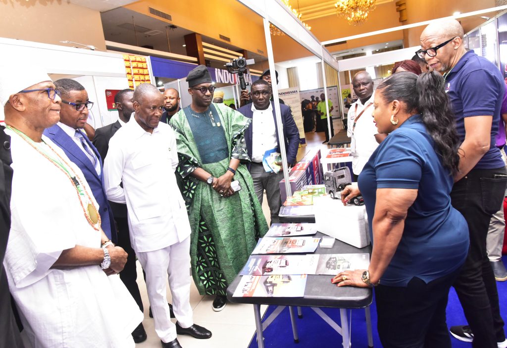 L-R: President of Manufacturers Association of Nigeria (MAN), Otunba Francis Meshioye; Deputy Governor, Cross River State, Peter Odey; Honourable Minister of State for Industry, Trade and Investment, Sen. John Enoh (Rep. of President of Nigeria); Director General, Manufacturers Association of Nigeria (MAN), Segun Ajayi-Kadir; during a visit to Dangote exhibition stand at the 53 Annual Meeting of Manufacturers Association of Nigeria (MAN)/5th Adetola Odutola Lecture Presidential Luncheon in Lagos on Thursday.