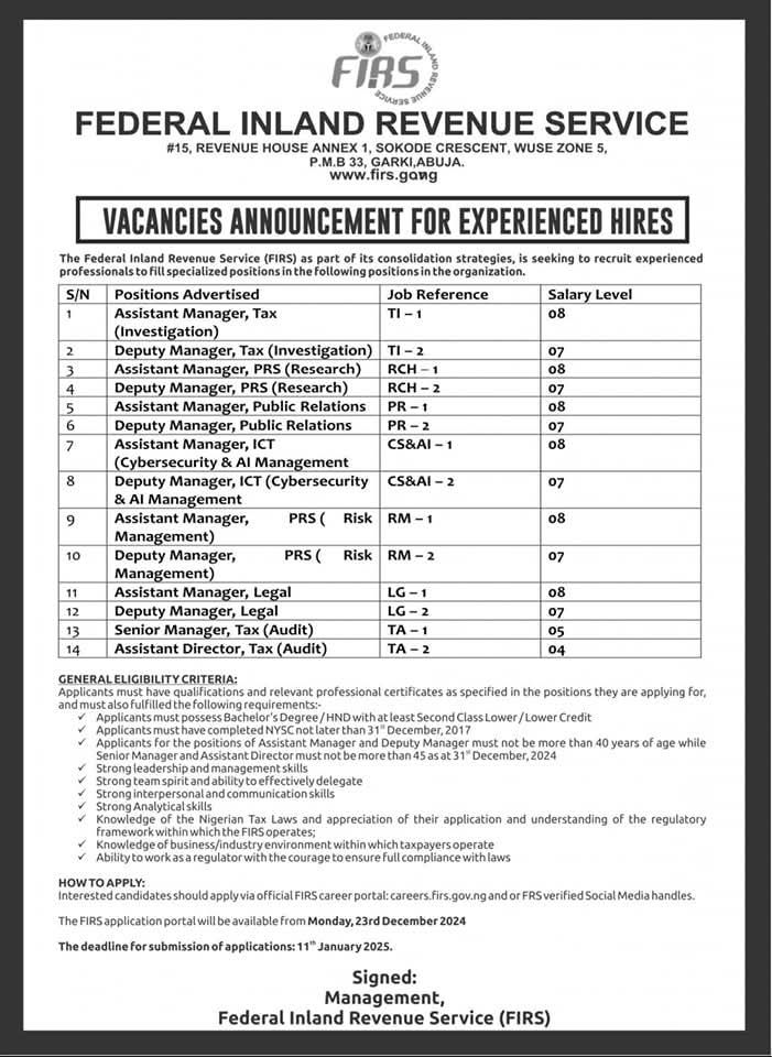 The Federal Inland Revenue Service (FIRS) has rolled out an exciting opportunity for experienced professionals to join its team.
