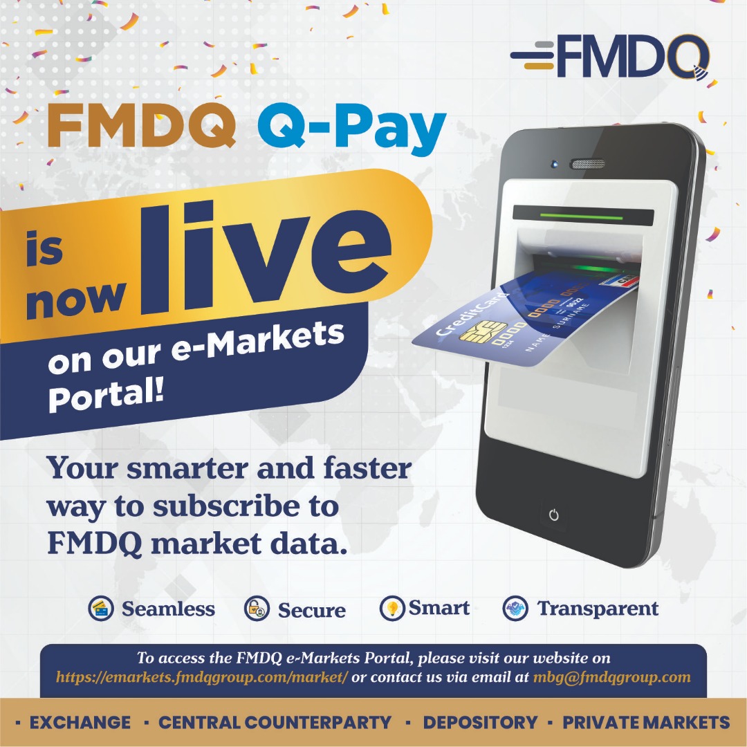 In line with its commitment to facilitate market transparency, as evident in the ongoing provision of essential market data and information on the Nigerian fixed income, currencies and derivatives markets to all its stakeholders, FMDQ Securities Exchange Limited (“FMDQ Exchange” or the“Exchange”), a wholly owned subsidiary of FMDQ Group PLC, is pleased to announce the official launch of FMDQ Q-Pay, a secure and efficient online payment gateway integrated into its flagship market data and information repository, the FMDQ e-Markets Portal (the “Portal”).The introduction of FMDQ Q-Pay marks a significant milestone in the enhancement of the Exchange’s market data services, following a recent restructuring aimed at improving service delivery and user experience. FMDQ Q-Pay is designed to facilitate easier access to market data and enable faster decision-making by users through a streamlined subscription payment process. The payment gateway ensures secure transaction processing and allows prospective subscribers to explore the Portal’s functionalities, features, and benefits before committing to a subscription, thereby promoting greater confidence in the platform and encouraging wider engagement.Speaking on the launch, the Managing Director, FMDQ Exchange, Ms. Tumi Sekoni stated, “The launch of FMDQ Q-Pay reinforces our commitment to transparency, liquidity, and information symmetry in the Nigerian capital markets. This innovation is a testament to our continued commitment to evolve with the needs of our market participants and provide efficient, user-friendly solutions that enhance their engagement with FMDQ Exchange and its markets. Looking ahead, the Exchange remains focused on delivering innovative market infrastructure solutions that support the development of Nigeria’s financial markets and empower our stakeholders with greater access, efficiency, and value”.Through continuous enhancement of its digital infrastructure, FMDQ Exchange is committed to empowering investors with seamless access to market data and services. With solutions like FMDQ QPay, the Exchange continues to drive innovation that simplifies investor interactions, supports datadriven strategies, and fosters greater confidence in Nigeria’s capital market.FMDQ Group PLC is Africa’s first vertically integrated financial market infrastructure (“FMI”) group, strategically positioned to provide registration, listing, quotation and noting services; integrated trading platform, clearing & central counterparty, and settlement services for financial markets transactions; depository of securities, as well as data and information services, across the debt capital, foreign exchange, derivatives and equity markets, through its wholly owned subsidiaries – FMDQ Exchange, FMDQ Clear Limited, FMDQ Depository Limited and FMDQ Private Markets Limited. As a sustainability-focused FMI group, FMDQ Group PLC, through FMDQ Exchange, operates Africa’s premier Green Exchange – FMDQ Green Exchange – positioned to lead the transition towards a sustainable future.For more information and to explore the FMDQ e-Markets Portal, please visit https://emarkets.fmdqgroup.com.
