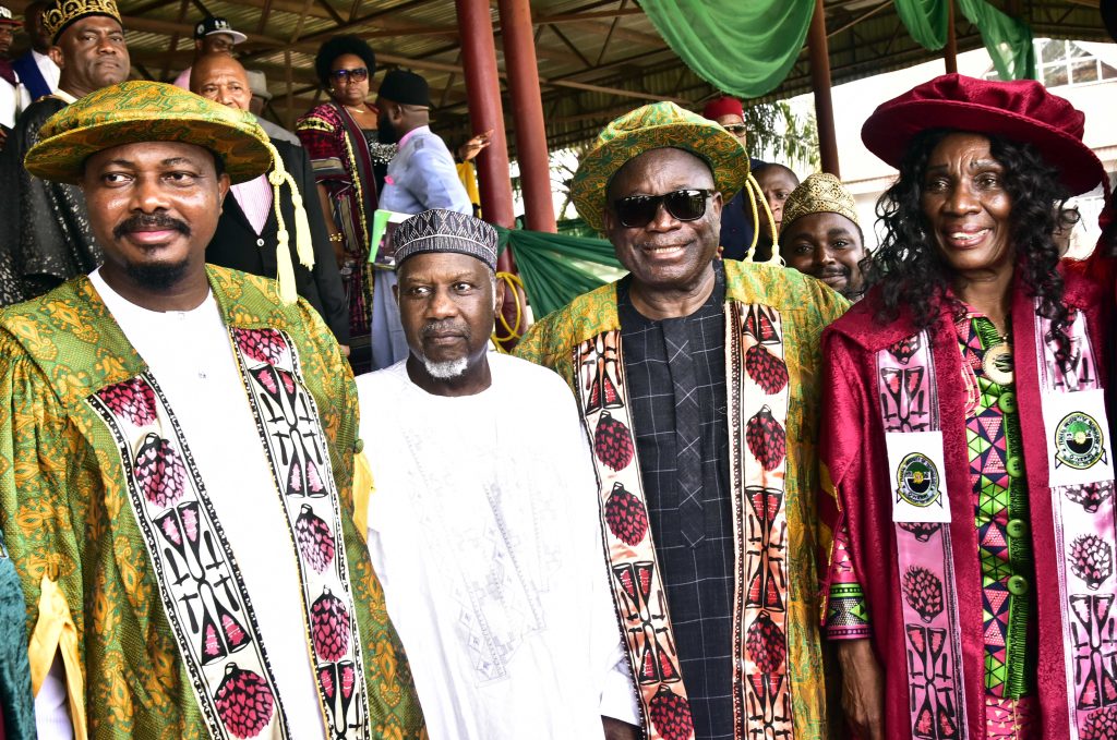 L-R, Representative of the President of Nigeria, Prof. Jesse Uneke; Representative of President / CE, Dangote Industries Ltd, Engr. Ahmed Mansur; Pro-Chancellor and Chairman of Council FUTO, Sen. Jack Tilley-Gyado; Vice Chancellor FUTO Professor (Mrs.) Nnenna N. Oti; at the Conferment of Honorary Doctorate Degree of Management Technology ( D.MT) Honoris Casua on Aliko Dangote; by (FUTO)Federal University of Technology Owerri Imo state on Saturday.